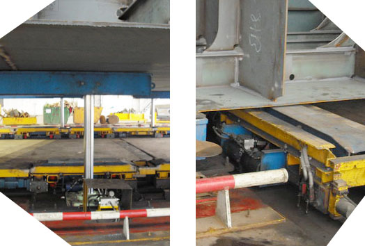 當(dāng)各船體頂升到位后,將平板小車放置于船體之下,以便進(jìn)行船體的移動(dòng)。某些船體更要放置三維調(diào)整設(shè)備,以便對船體的三個(gè)維度都進(jìn)行控制。